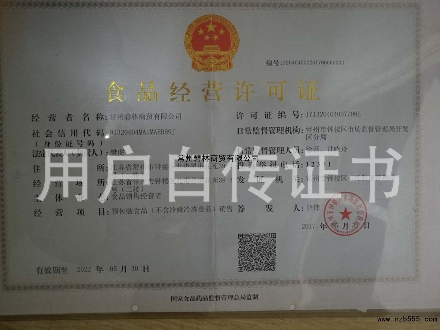 | 發(fā)證機(jī)構(gòu): | 常州市鐘樓區(qū)市場(chǎng)監(jiān)督管理局 | 發(fā)證時(shí)間 : | 2017-05-31 |