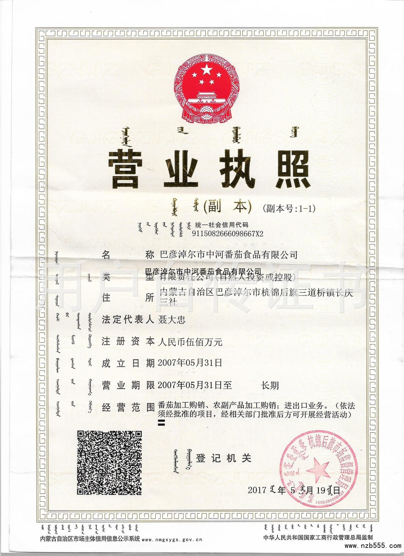 | 發(fā)證機(jī)構(gòu): | 杭錦后旗市市場監(jiān)督管理局 | 發(fā)證時(shí)間 : | 2017-05-19 |